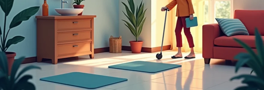 Les obstacles au sol causent 30% des chutes domiciliaires. Les tapis non fixés représentent le piège le plus fréquent, particulièrement dangereux aux seuils de portes et dans les zones de passage. Leur suppression ou leur fixation définitive par adhésifs double-face haute performance élimine ce risque. Les tapis de plus de 5 mm d’épaisseur créent des dénivelés particulièrement problématiques pour les seniors utilisant un déambulateur.